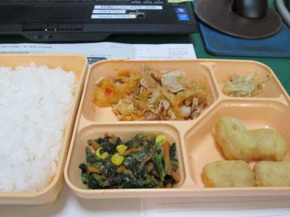 本日のメニューは、「豚肉炒めのチリソース」「イカ天」「ホウレンソウのオイスターソース炒め」。