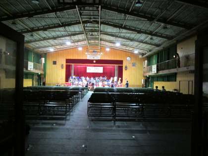設営のできた体育館で、吹奏楽部が最後のリハーサルを行っています。