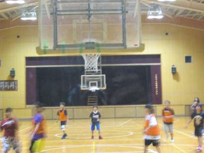 体育館では、保護者の皆様が見守る中、地域バスケットボールチームの練習が、活発に行われていました。