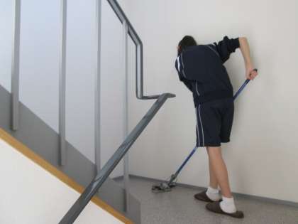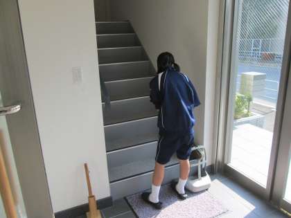会社内の階段のお掃除。仕事のいろはは、掃除から。