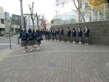 あいさつ運動の中、3年生はテスト勉強しながら通過して行きます。