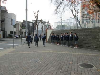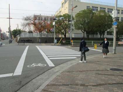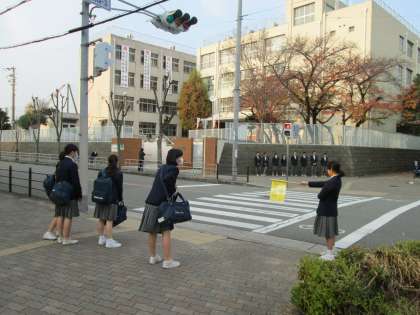 生徒会役員が、黄色の旗を持って、横断歩道での注意喚起を!
