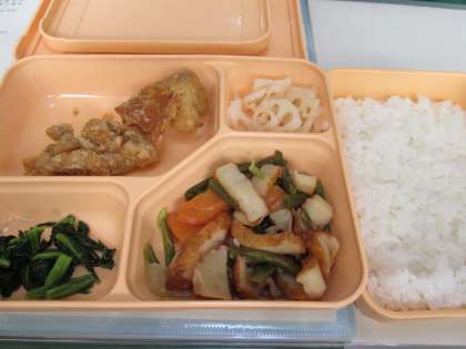 今日のメニューは、「鶏のから揚げ」「煮物」「おひたし」「れんこんの酢物」。