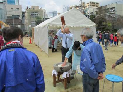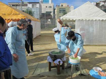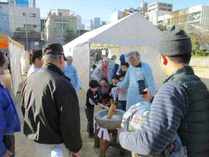中学生がボランティアとして参加し、地域の皆様とともに協力してお餅づくりを行い、集まられたご家庭にお餅をふるまっておられました。