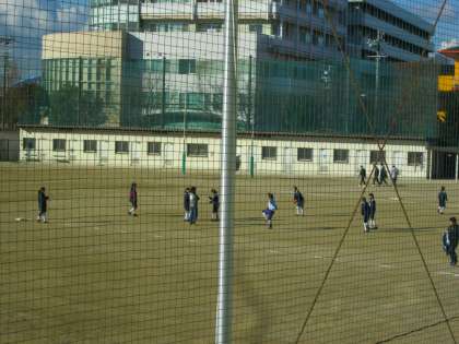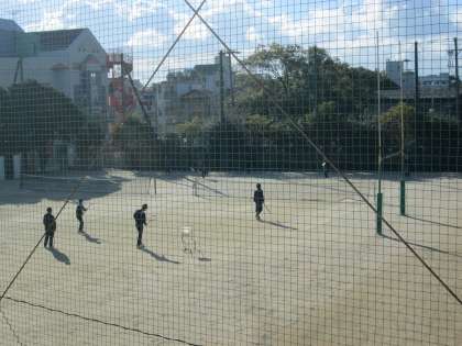 極寒の中、太陽の眩しい暖かさが降り注ぐグラウンドで、硬式テニス部が生き生きと活動しています。顧問の先生もラケットを持って!