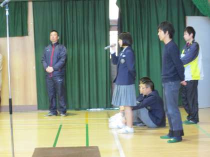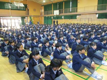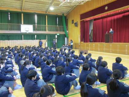 底冷えの体育館で、週の初めの全校集会が行われました。