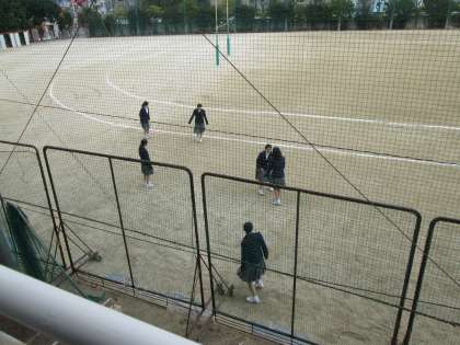グラウンドを見ると、女子生徒が走り回って遊んでいます。