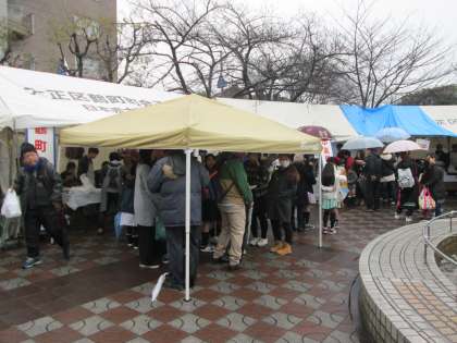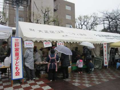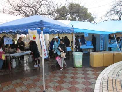 雨対策で急遽シートの屋根が張られ、お昼時の食べ物やお菓子がたくさん作られていました。