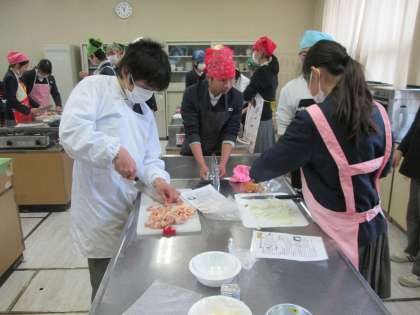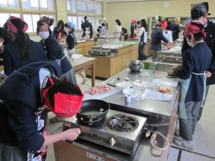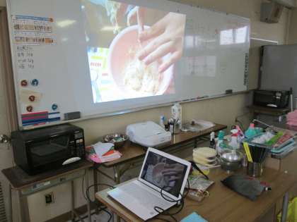 パソコンとプロジェクターの活用で、調理の方法を説明。