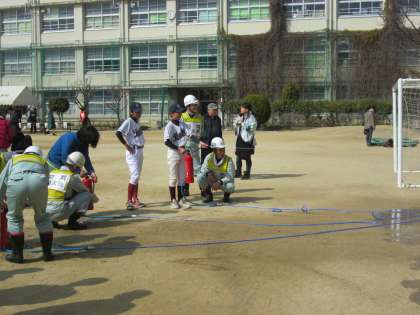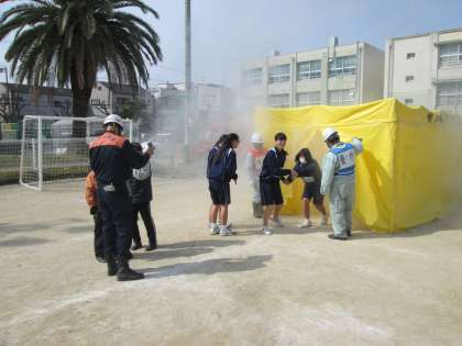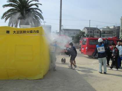水消火器による消火器の使用方法、煙トンネルでの火災体験です。