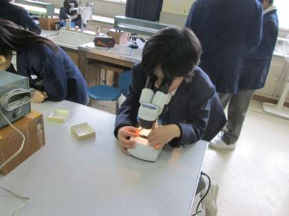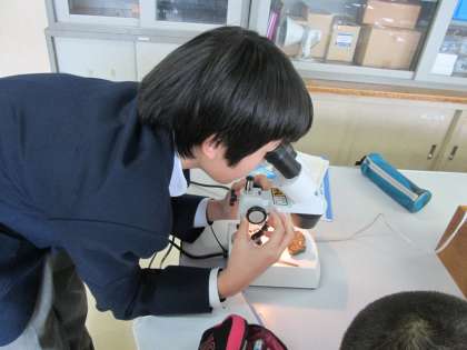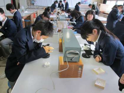 生徒たちは、興味津々で顕微鏡を覗いています。