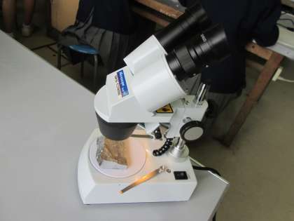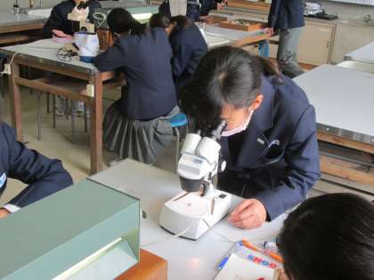 先生の指導のもと、生徒たちは顕微鏡を上手に使いこなしています。