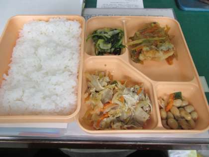 今日のメニューは「白身魚のカレーあんかけ」「豚肉と野菜の炒めもの」「ほうれん草と白菜の胡麻あえ」「大豆と昆布の煮もの」。