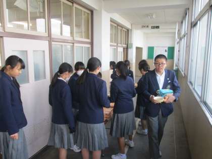 係生徒が、みそ汁を入れてくれています。