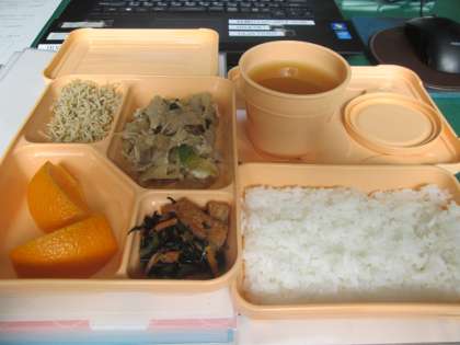 本日のメニューは、「しらすご飯」「豚肉のしょうが焼き」「ひじきの煮物」「デコポン」と「みそ汁」でした。