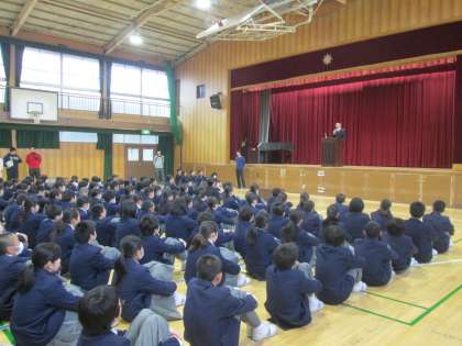 3年生が卒業し、1・2年だけの寂しい集会です。