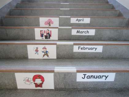 英語科の先生のアイデアで、「階段アート」ができあがっています。
