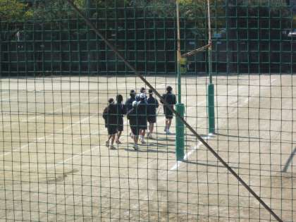 ソフトボール部は荒れた運動場を整地中。ソフトテニス部はランニングに入りました。