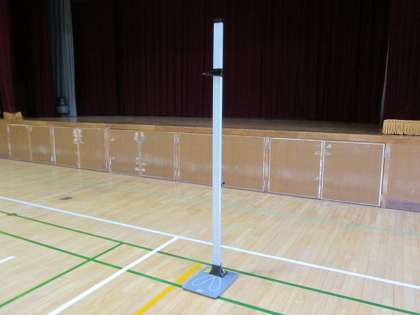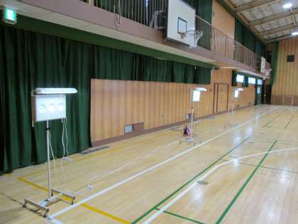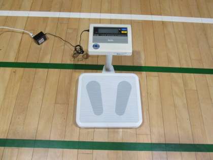 体育館に身長計、体重計、そして、視力検査器がセットされています。