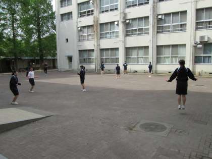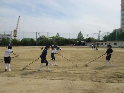 グラウンド整備に追われるソフトボール部、縄跳びで鍛えるバドミントン部です。
