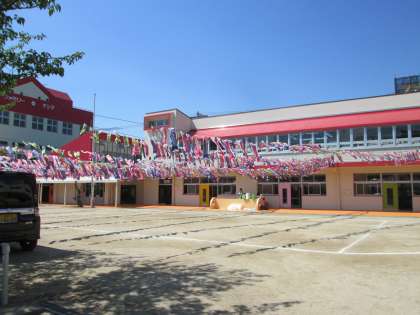 青空に泳ぐ大きな鯉のぼりと、保育園の園庭いっぱいの可愛いこいのぼりです。