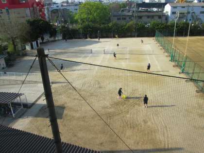 ソフトテニス部は早くからアップ。本日の大会に備えます。