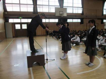 全校集会に先立ち、前期学級役員の認証式を行いました。
