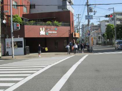 赤信号で渡りそうになった男子生徒が、役員の呼びかけで、しっかり戻ってくれました。