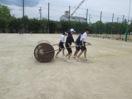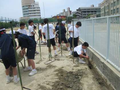硬式テニス部、ソフトテニス部が、テニスコートの整備をしています。