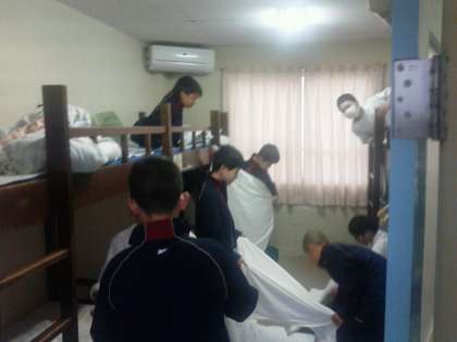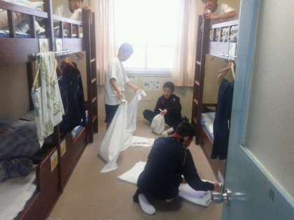 協力してシーツをたたんでいます。