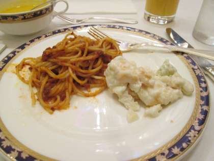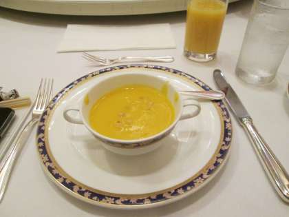 メニューはサラダ、コーンポタージュから始まり、メインはボリュームのある「ジューシーハンバーグ」でした。