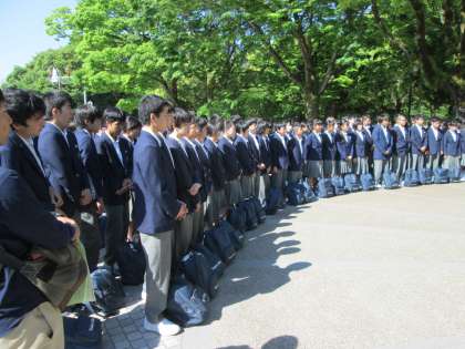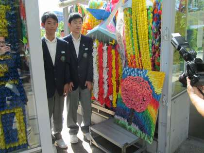 亡くなった皆様へ黙とうをささげ、学校でみんなの手によって作成した千羽鶴のレリーフを奉納しました。