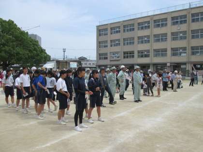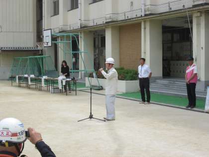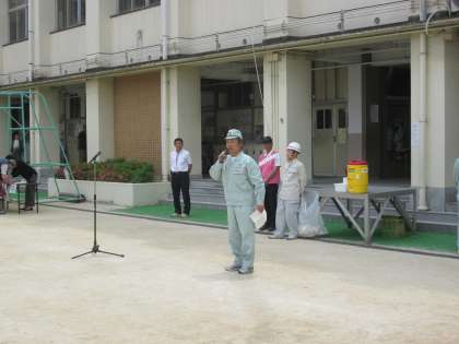 本校も保護司会などで大変お世話になっている山本様の司会進行のもと、スタッフ、参加者がグラウンドに整列し、社会福祉協議会山本会長のごあいさつから始まりました。