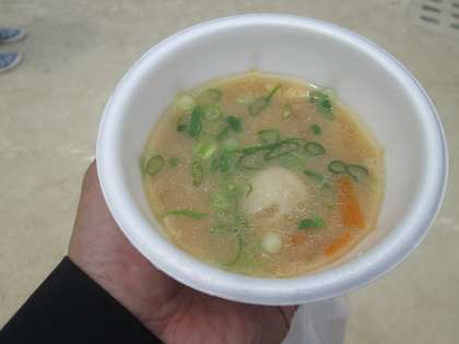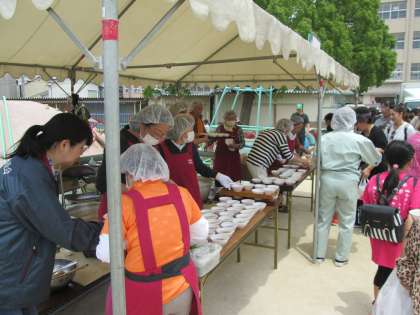 体験後は、皆様にアルファ米のかやくご飯と、自慢の豚汁がふるまわれました。