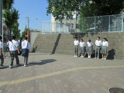 太陽がとてもまぶしい中、生徒会役員の「あいさつ運動」が展開されています。
