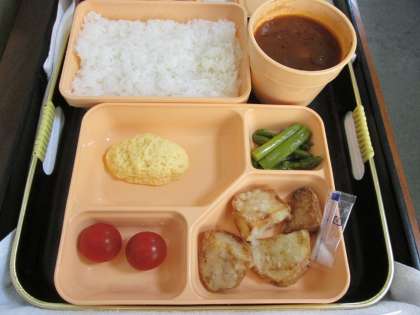 ミニトマト、オムレツ、グリーンアスパラ、フライドポテトがついていました。