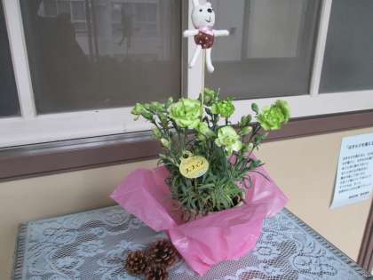 校長室前に、「スフェン」というカーネーションに似た、薄緑色の花が飾られました。