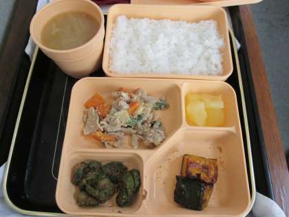 本日のメニューは、「豚肉とじゃがいもの煮物」「かぼちゃの醤油焼き」「きゅうりのおかか和え」そして「具だくさんのみそ汁」でした。
