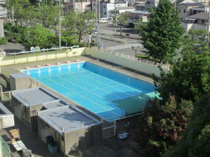 昨日、運動部によるプール掃除が行われ、太陽に輝くきれいなブルーが蘇りました。