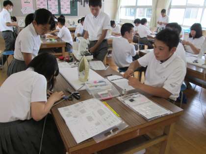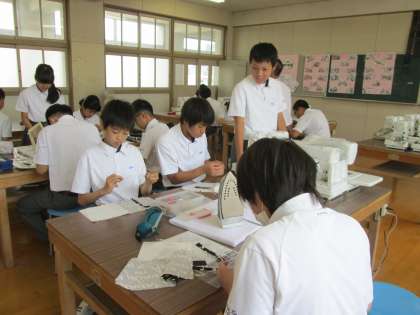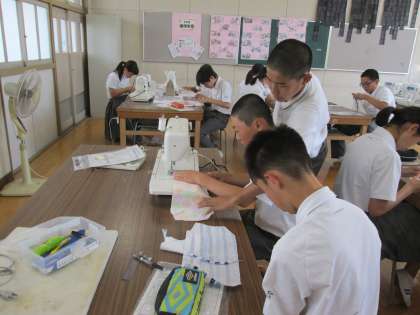 被服室での家庭科の実習。