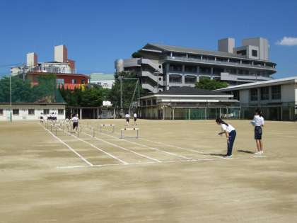 教育実習生が、ハードル走の授業を展開しています。
