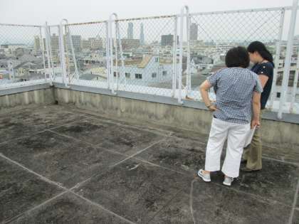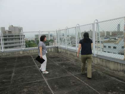 天井の水漏れ、教室内の床の傷み、外壁のくずれなど、確認いただきました。