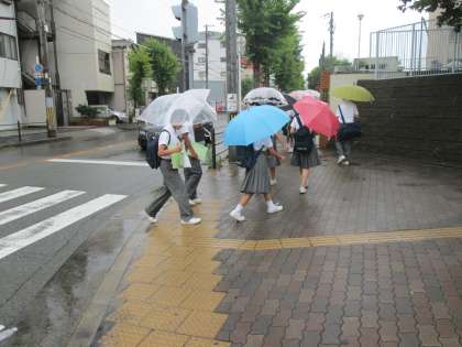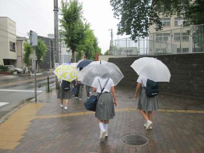 雨の中、生徒たちが登校して来ました。
