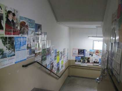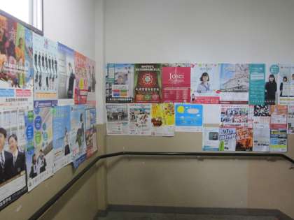 その踊り場を中心に、高等学校のポスターが張り巡らされています。