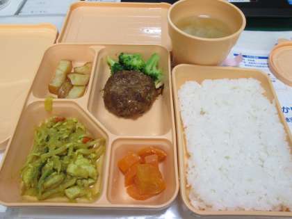 今日のメニューは、「チーズ入りのハンバーグ」「鶏肉と野菜のカレー炒め」「フライドポテト」「キャベツとコーンのスープ」でした。