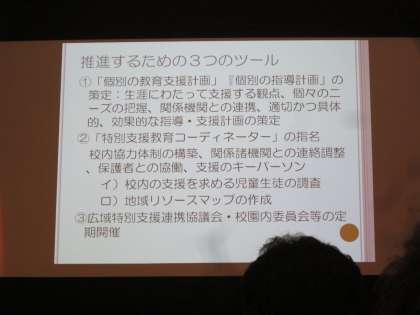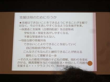 ご講演では、これからの教育の方向性から、一人ひとりの教育的ニーズを知ること、推進のためのツール、気づきから始まる支援、個別の教育支援計画の意義、セルフエスティーム、支援は何のために行うのかなど、詳しくお話を伺うことができました。