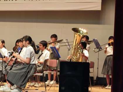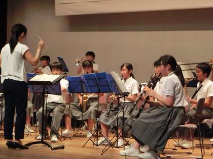 真剣な眼差しで、指揮者を見ながら演奏します。