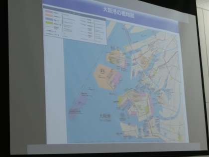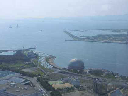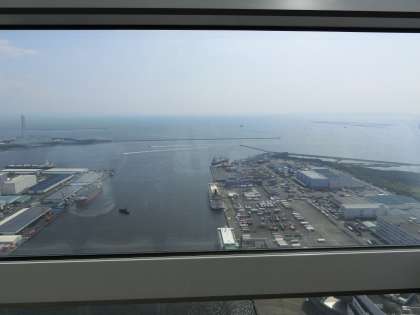 眼下に、咲洲(大阪南港)・舞洲(大阪北港)、そして、その間の夢洲と、大阪港が広がっています。