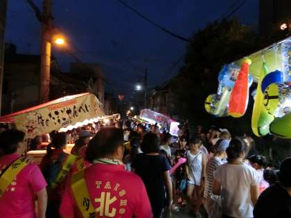 商店街を抜け、神社近くに出ると、夜店がたくさん立ち並び、大勢の人々で賑わっていました。