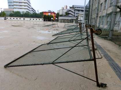 台風が近づくため、バスケット部の諸君と教職員で、雨の中、テントや防球ネットを避難させてくれました。感謝!